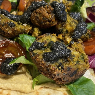 Flatbread, Hummus, Leafy Salad, Falafel, Black Tahini